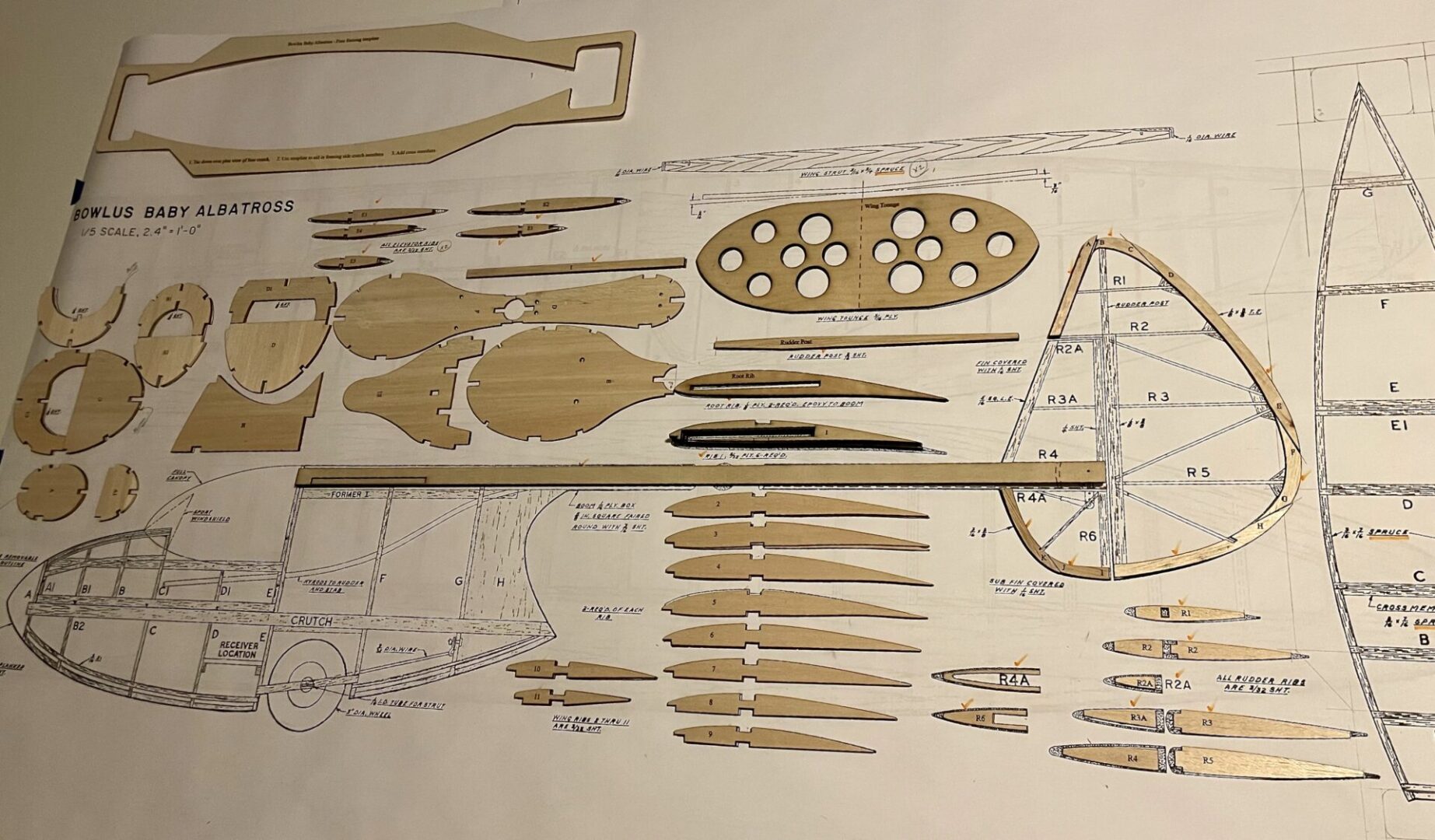 This is a laser cut short kit for the Bowlus Baby Albatross scale glider with a 105″ wingspan – 1/5 scale.